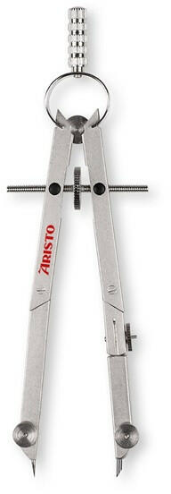 Tömör fémből készült ezüst színű körzőszárak. Masszív, recézett, fém fogórész, hullámos markolat. A két csuklós körzőszár menetes orsóval van összekötve. A finombeállítás az orsón található állítótárcsával történik. Furat átmérő 4,0 mm, maximális kör sugara 265 mm, hosszabbító szárral 500 mm-re növelhető. A dobozban egy hosszabbító szár, egy univerzális adapter és két tartalékhegy található.